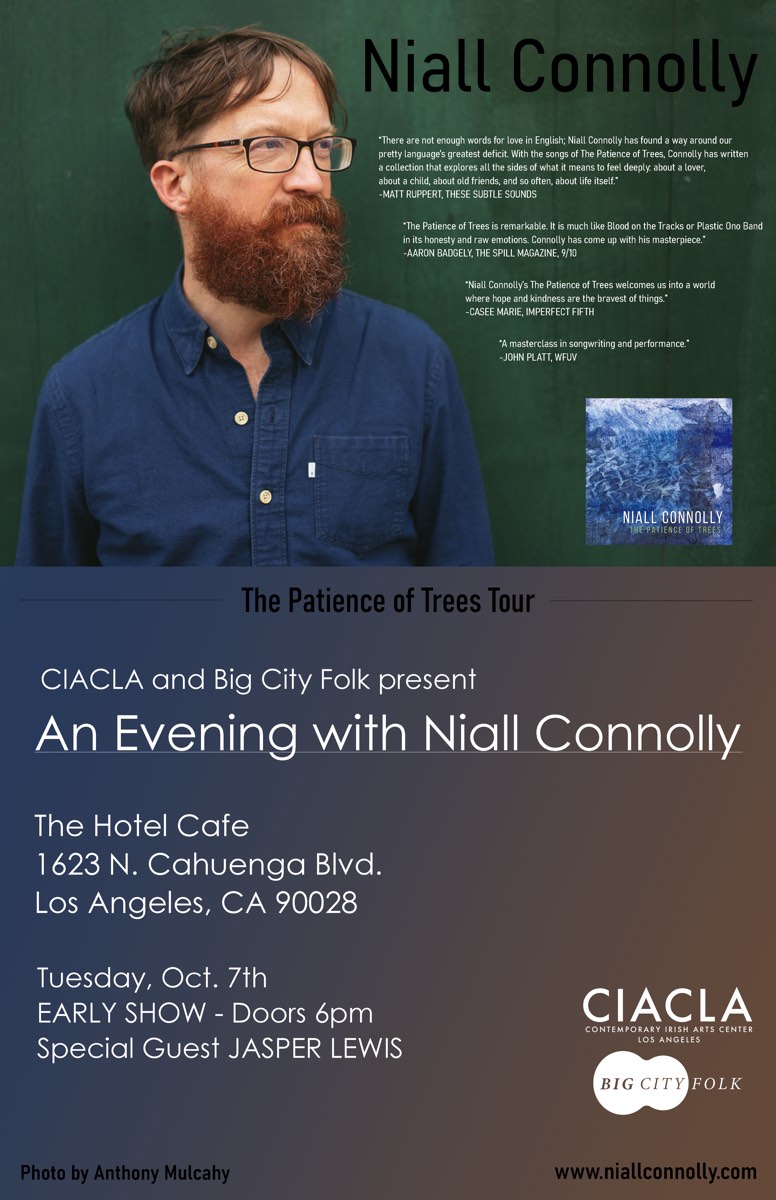 Niall Connolly is touring in support of his 9th studio album, ‘The Patience of Trees’, Connolly’s songs are slow-simmered, rich with family histories, and woven with a golden thread of dark Irish humor. Niall Connolly has toured all over Europe and US and has shared the stage with Glen Hansard, Evan Dando, Lucius, Lisa Hannigan, Mick Flannery and many more. Don’t miss this rare LA performance from one of Ireland’s best kept secrets.